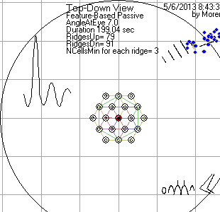 In simulations, my methods compute images from echoes of dolphin-clicks off simulated fish. This image was made by a simulator. The simulated, skeletal "fish" is shown in a side view at the bottom. The blue dots were computed from simulated echoes off the fish. The image was from an experiment in "passive" mode, wherein the click could have come from a dolphin or some other boat. In "active" mode, there would be blue dots in the side view because ranges would be computed in addition to directions. The hexagons were relevant to the array as it was back when the sequence of images was made.